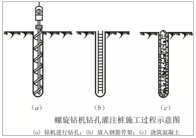 1、干作業(yè)成孔一般采用螺旋鉆機鉆孔。螺旋鉆頭外徑分別為Φ400mm、Φ500mm、Φ600mm,鉆孔深度相應(yīng)為12m、10m、8m。適用于成孔深度內(nèi)沒有地下水的一般粘土層、砂土及人工填土地基,不適于有地下水的土層和淤泥質(zhì)土。