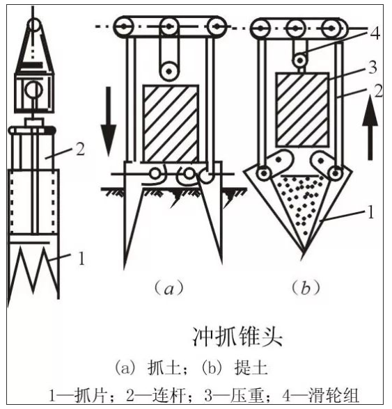 ① 沖抓錐錐頭上有一重鐵塊和活動抓片,通過機架和卷揚機將沖抓錐提升到一定高度,下落時松開卷筒剎車,抓片張開,錐頭便自由下落沖入土中,然后開動卷揚機提升錐頭,這時抓片閉合抓土。沖抓錐整體提升至地面上卸去土渣,依次循環(huán)成孔。