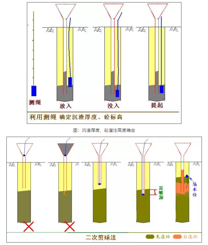 在澆注前,探測孔底泥漿沉淀厚度,如大于設(shè)計厚度,再次清孔,直到滿足要求為止。