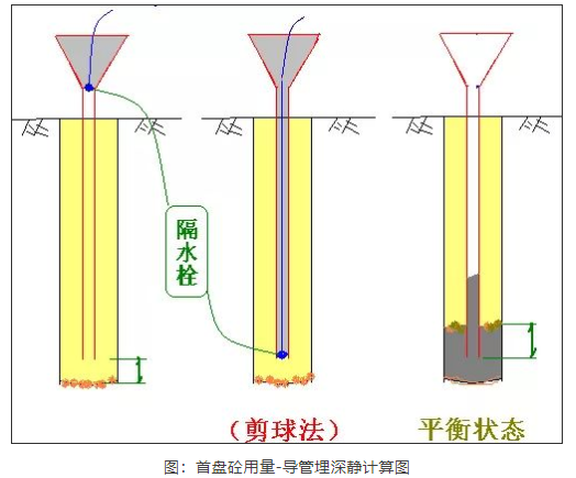 澆筑時,先將導管內(nèi)及漏斗灌滿混凝土,其量保證導管下端一次埋入混凝土面以下1.0m以上,然后剪斷(或迅速拔出)懸吊隔水栓的鋼絲,混凝土拌和物在自重作用下迅速排出球塞進入水中。