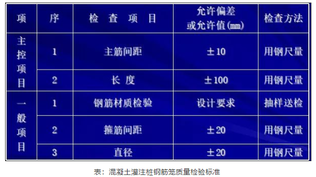 鋼筋籠主筋的保護層允許偏差:水下灌注混凝土樁為±20mm;非水下灌注混凝土樁為±10mm。